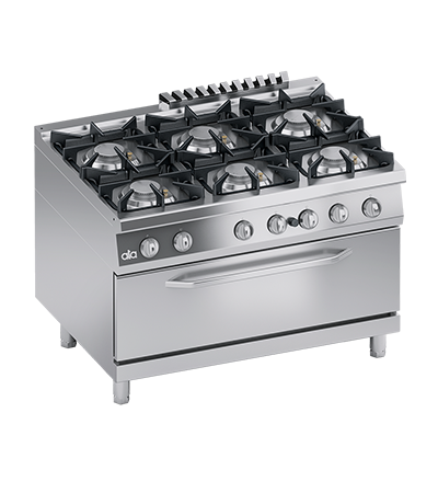 FOURNEAU A GAZ 6 BRULEURS AVEC FOUR GAZ 1/1 GN et CABINET OUVERT AVEC VEILLEUSE - SOLUTION LINE