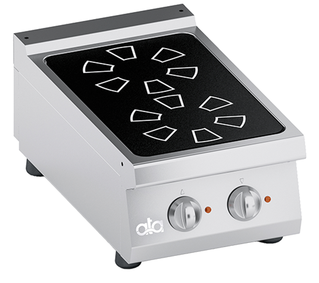 Piano in vetroceramica nero di spessore 6 mm. Riscaldamento ottenuto grazie a piastre elettriche rotonde a irraggiamento fissate sottovetro. Ogni piastra è dotata di un regolatore di energia che permette di regolare la frequenza di funzionamento alla massima potenza. Sicurezza garantita da un limitatore di temperatura posto internamente alla piastra.